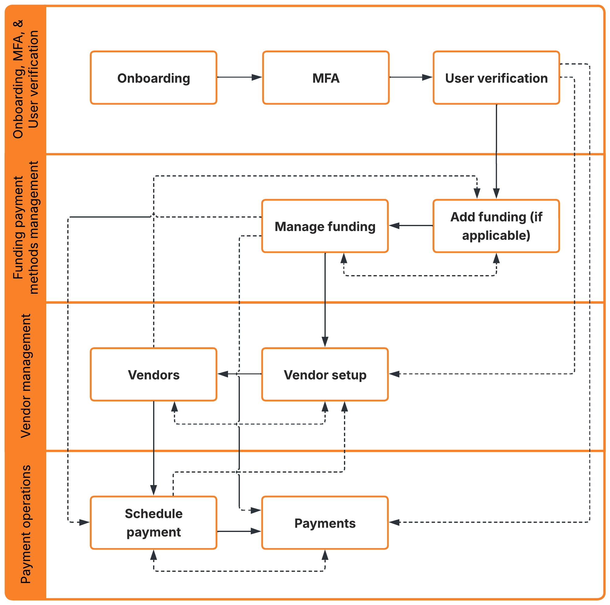 We illustrate a user journey from onboarding to AP payments. In this workflow, solid lines show the primary flow, and dotted lines indicate possible variations.