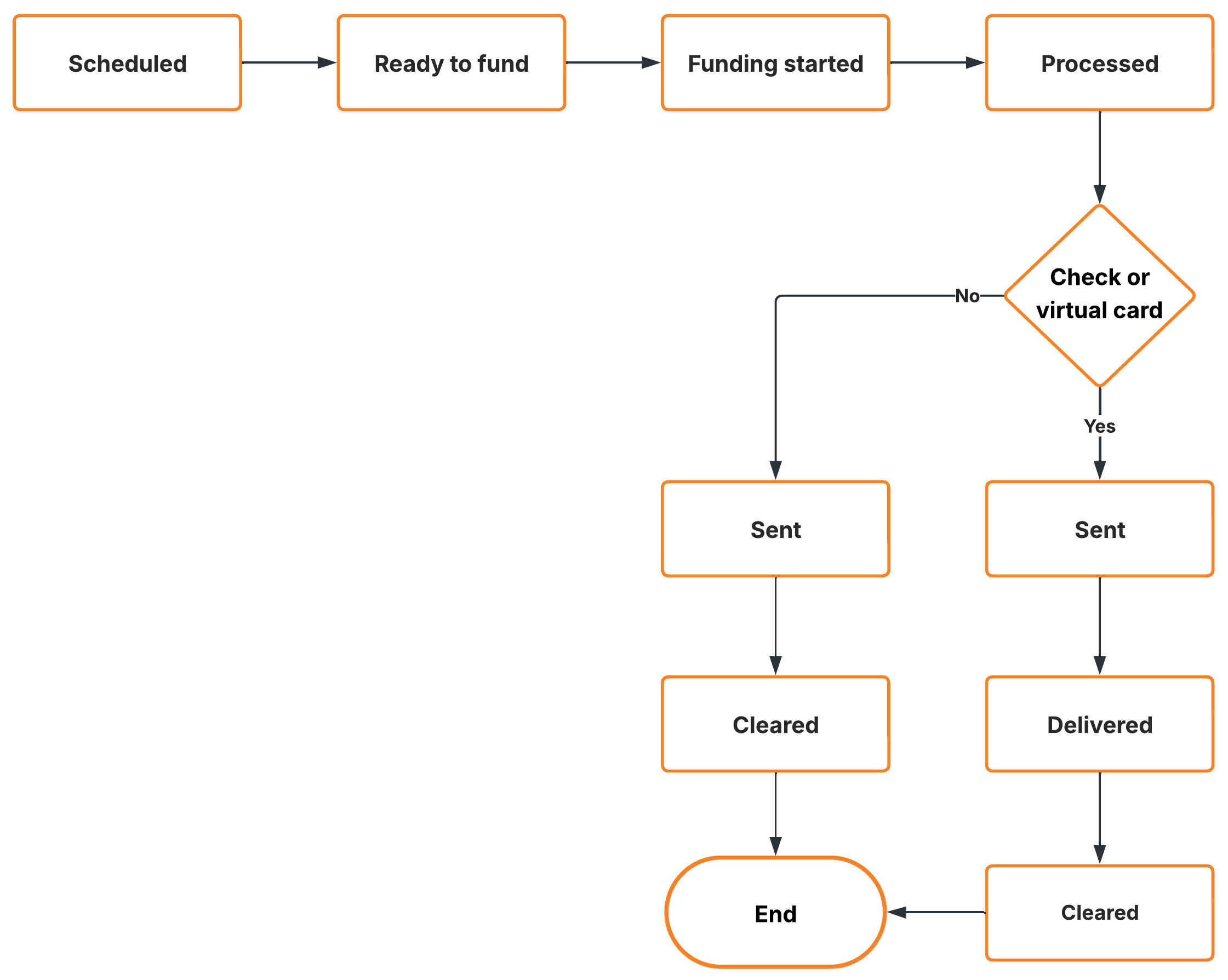 GET /v3/payments/paymentId) or the Payments Element for the most up-to-date status. - Webhooks warning: Some statuses are temporary. For example, Virtual Cards move from Sent to Delivered instantly, so you may only receive the Delivered webhook.