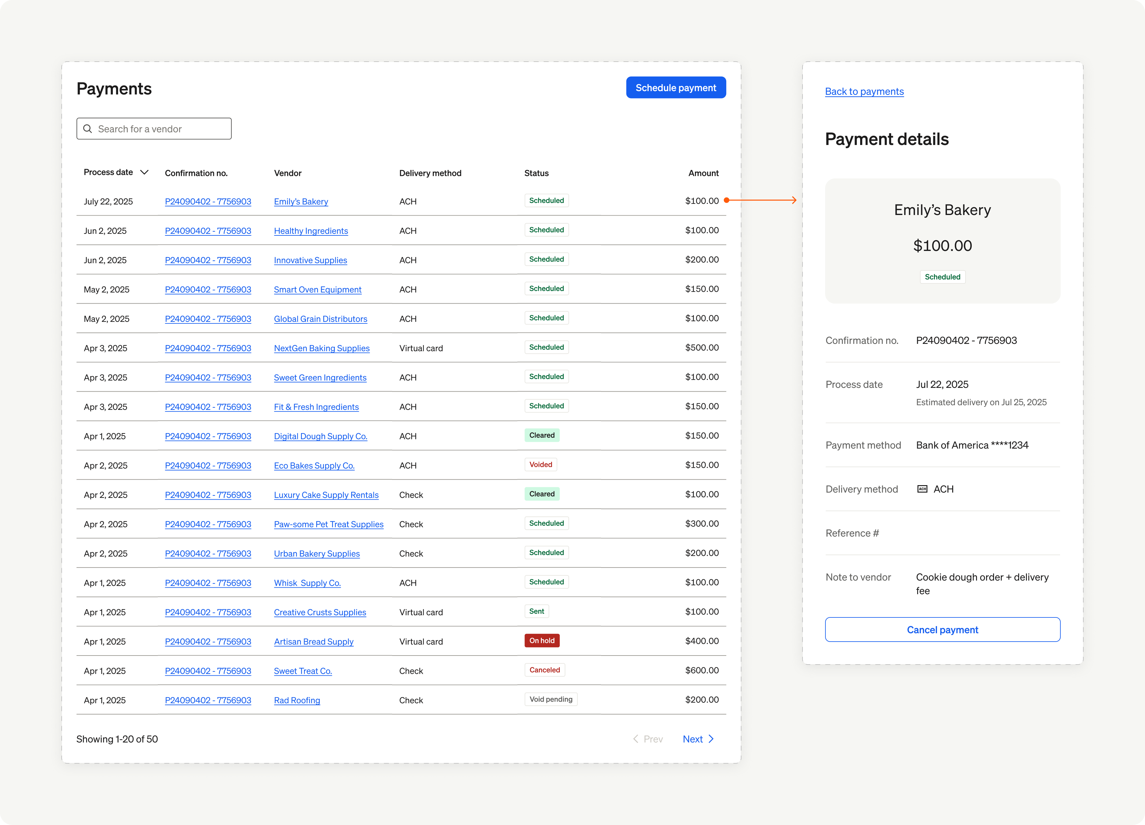 | Schedule a payment | Schedule a one time payment to a vendor. When scheduling a payment, users can add payment details, such as funding payment method, a note for their vendor, and a process date for today or for a date in the future. Vendors will receive payments in their set payment method - ACH, virtual card, or check. |