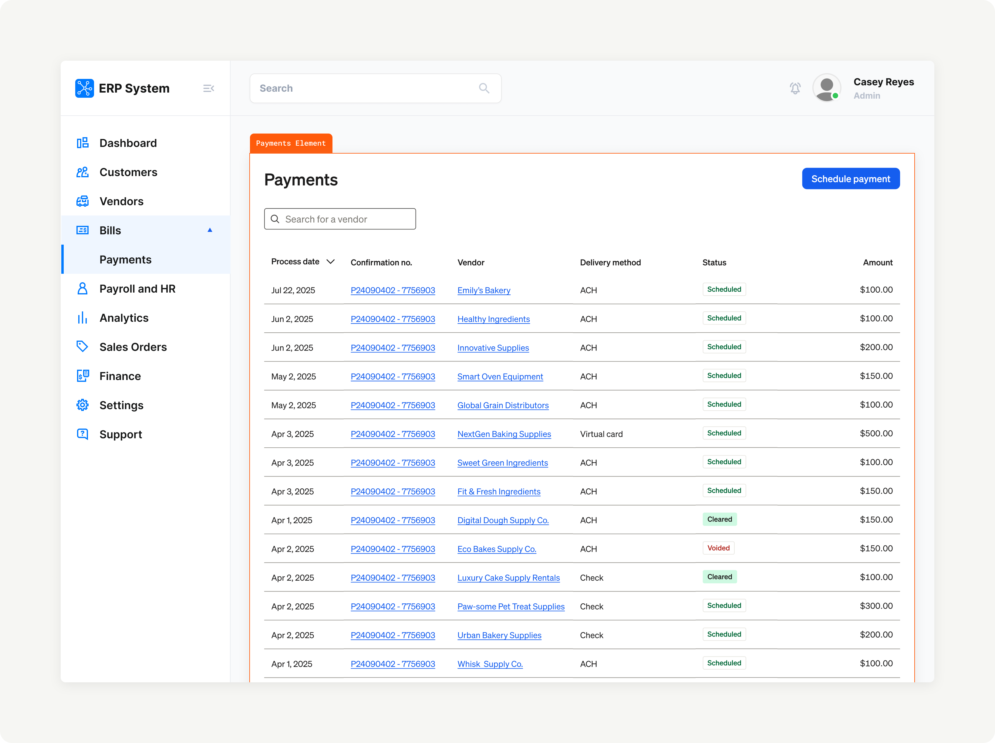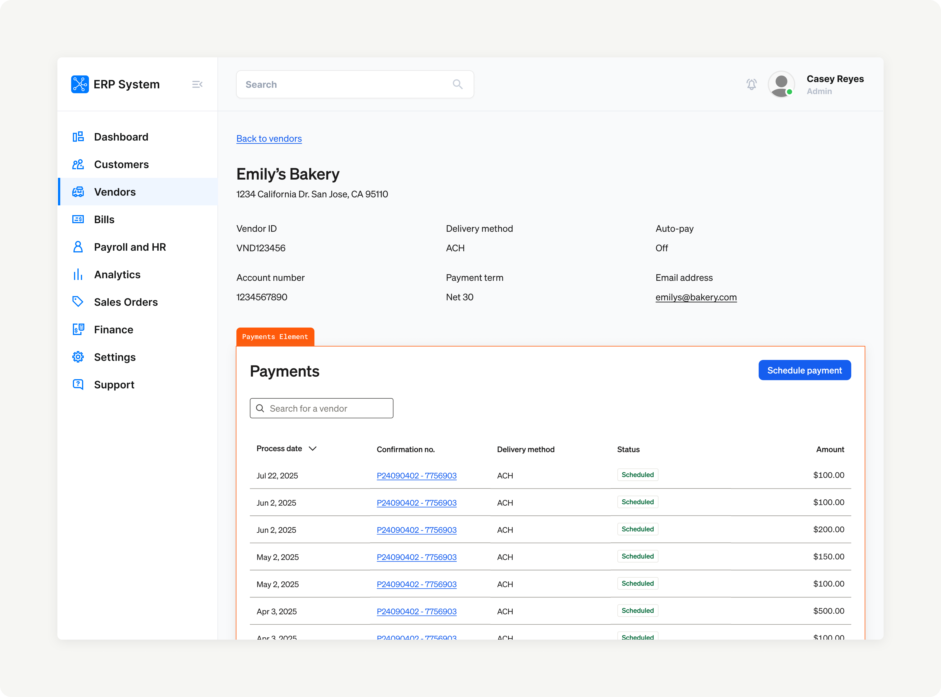 Child | Schedule payment Element: The user can schedule a one-time payment to a vendor. |
